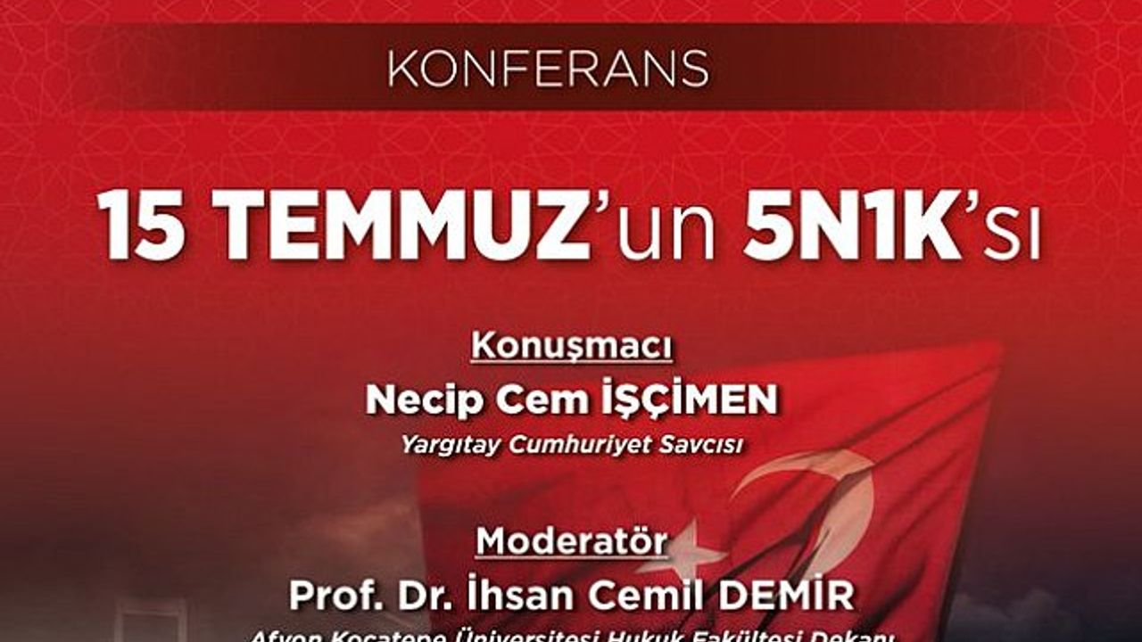 11 Temmuz 2024 Perşembe günü, Afyon Kocatepe Üniversitesi Atatürk Kongre Merkezi'nde düzenlenecek olan 15 Temmuz Demokrasi ve Milli Birlik Günü anma etkinliği, Yargıtay Cumhuriyet Savcısı Necip Cem İşçimen'in katılımıyla gerçekleşecek. Etkinlik saat 14.00'da başlayacak ve Necip Cem İşçimen, konuşmasında 15 Temmuz'un önemi ve bu olayın milletin zaferi üzerindeki etkisi üzerinde duracak.