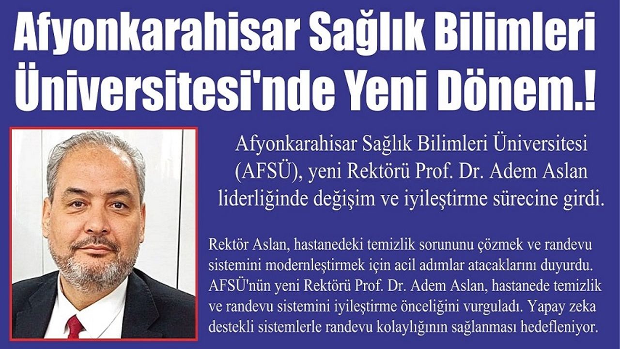 Afyonkarahisar Sağlık Bilimleri Üniversitesi (AFSÜ), yeni Rektörü Prof. Dr. Adem Aslan liderliğinde değişim ve iyileştirme sürecine girdi. Rektör Aslan, hastanedeki temizlik sorununu çözmek ve randevu sistemini modernleştirmek için acil adımlar atacaklarını duyurdu.