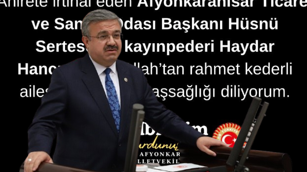 Afyonkarahisar Ticaret ve Sanayi Odası Başkanı Hüsnü Serteser’in kayınpederi Haydar Hancıoğlu hayatını kaybetti. Ak Parti Afyonkarahisar Milletvekili Av. İbrahim Yurdunuseven, Hancıoğlu'nun vefatı dolayısıyla başsağlığı mesajı yayınladı.