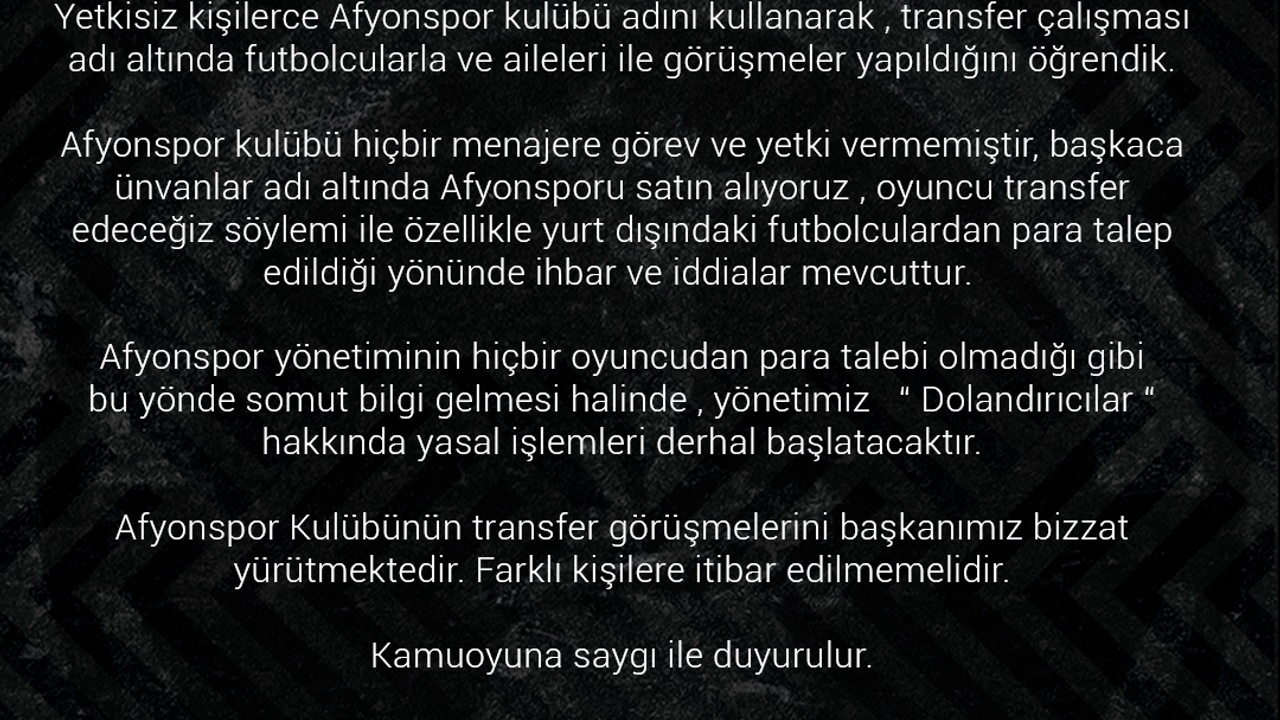 Yetkisiz kişilerce Afyonspor kulübü adı kullanarak , transfer çalışması adı altında futbolcular ve aileleri ile görüşmeler yapıldığını öğrendik.