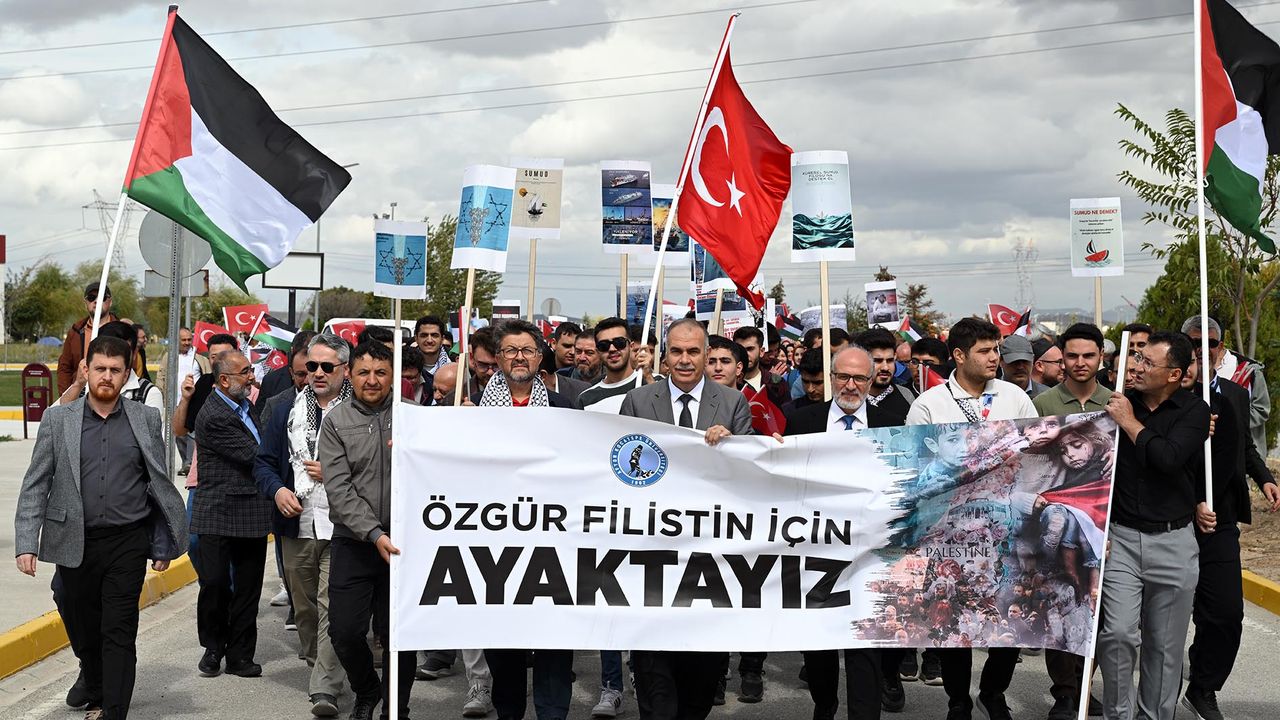 Afyon Kocatepe Üniversitesi (AKÜ) akademik ve idari personeli ile öğrencileri, İsrail’in Gazze’ye yönelik saldırılarını protesto etmek ve Küresel Sumud Filosu’na destek vermek amacıyla, eğitim-öğretim yılının altıncı gününde de yürüyüşlerine devam etti.