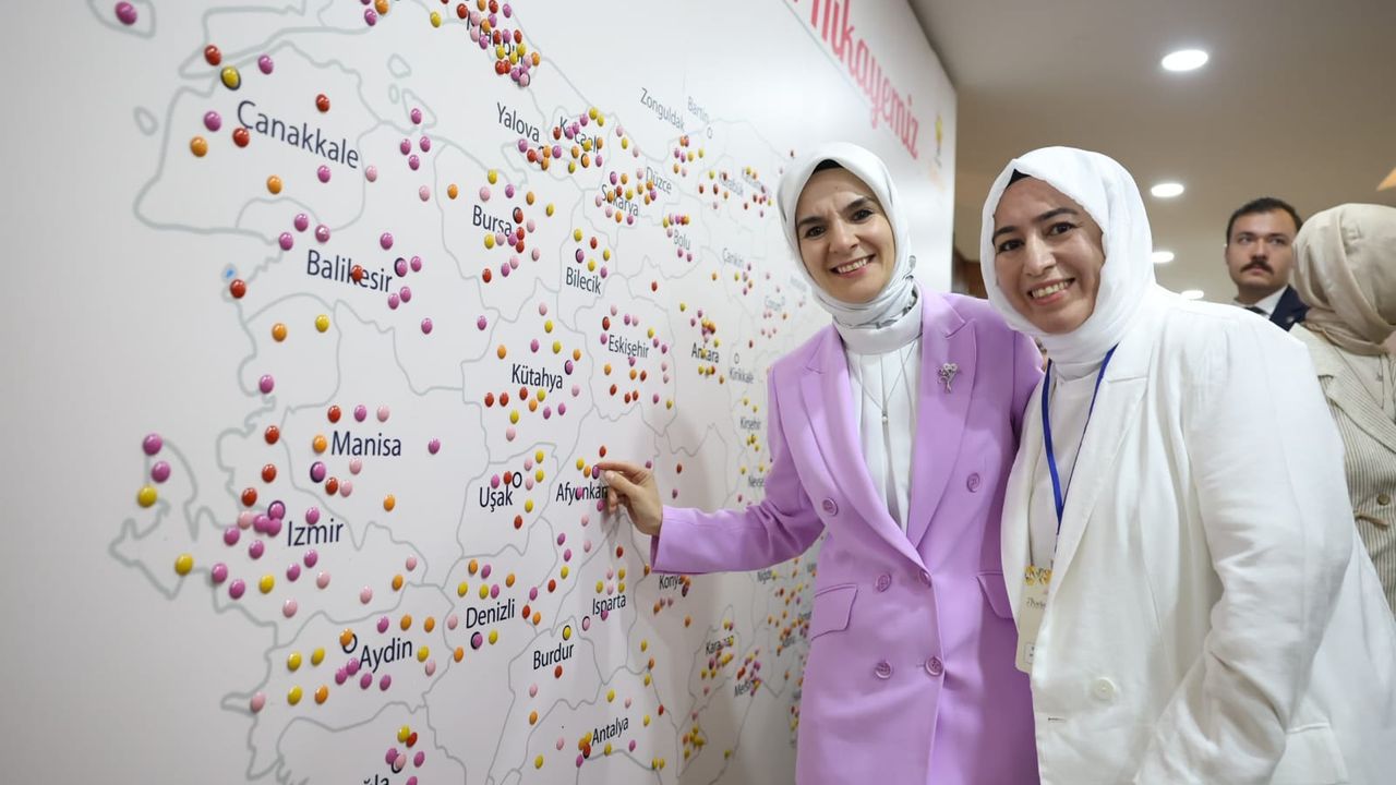 Aile ve Sosyal Hizmetler Bakanı Mahinur Özdemir Göktaş ve İl Kadın Kolları Başkanı Dilek Hanım Çengel, Türkiye haritası önünde hatıra fotoğrafı çektirerek bu anlamlı anı ölümsüzleştirdi.