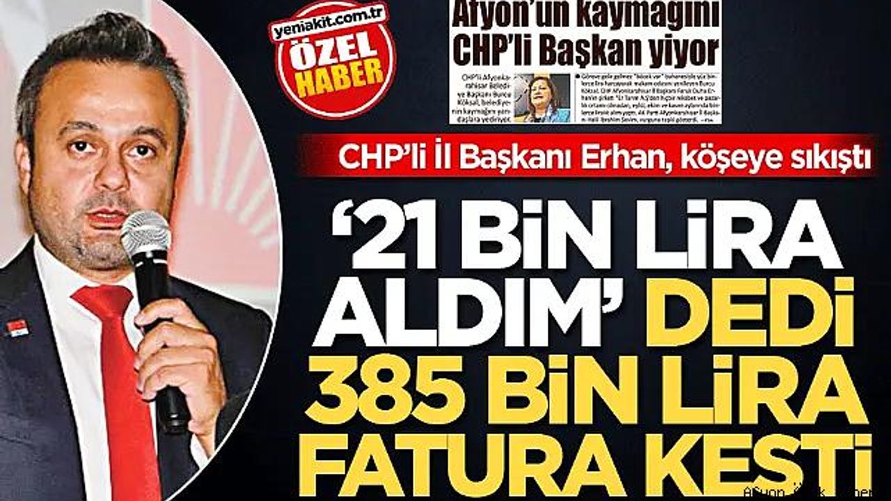 CHP"li Afyonkarahisar Belediyesindeki rant çarkını, “Afyon"un kaymağını CHP"li Başkan yiyor” başlığıyla ifşa ettiğimiz haber sonrası, İl Başkanı Faruk Duha Erhan, belediyeye sadece 21 bin liralık yedek parça sattığını ileri sürerken, akit"in ele geçirdiği belgelerde Erhan"ın belediyeye 384 bin 898 lira fatura kestiği ortaya çıktı.