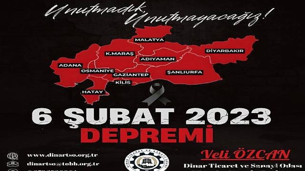 Dinar Ticaret Odası Yönetim Kurulu Başkanı Veli Özcan, 6 Şubat depremlerinin yıldönümü dolayısıyla yaptığı açıklamada, bu tür felaketlerin bir daha yaşanmaması temennisinde bulundu. Özcan, depremler sırasında hayatını kaybeden vatandaşlar için de rahmet ve yakınlarına başsağlığı dileklerini iletti.