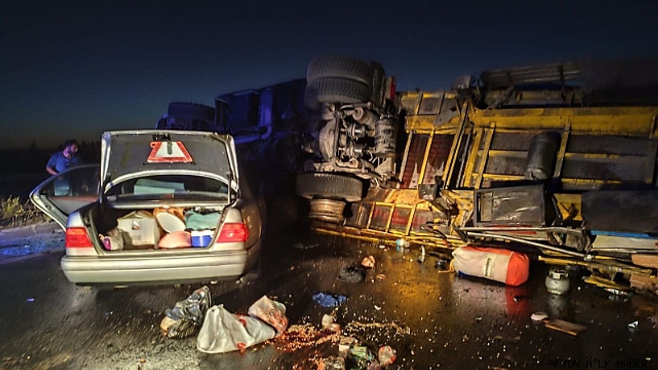 Ö.Y. idaresindeki 27 ALF 709 plakalı tır, Afyonkarahisar-Konya kara yolunun 11. kilometresinde bariyere çarparak yola devrildi. N.Ç'nin (65) kullandığı 64 KC 777 plakalı otomobil de devrilen tıra çarptı.