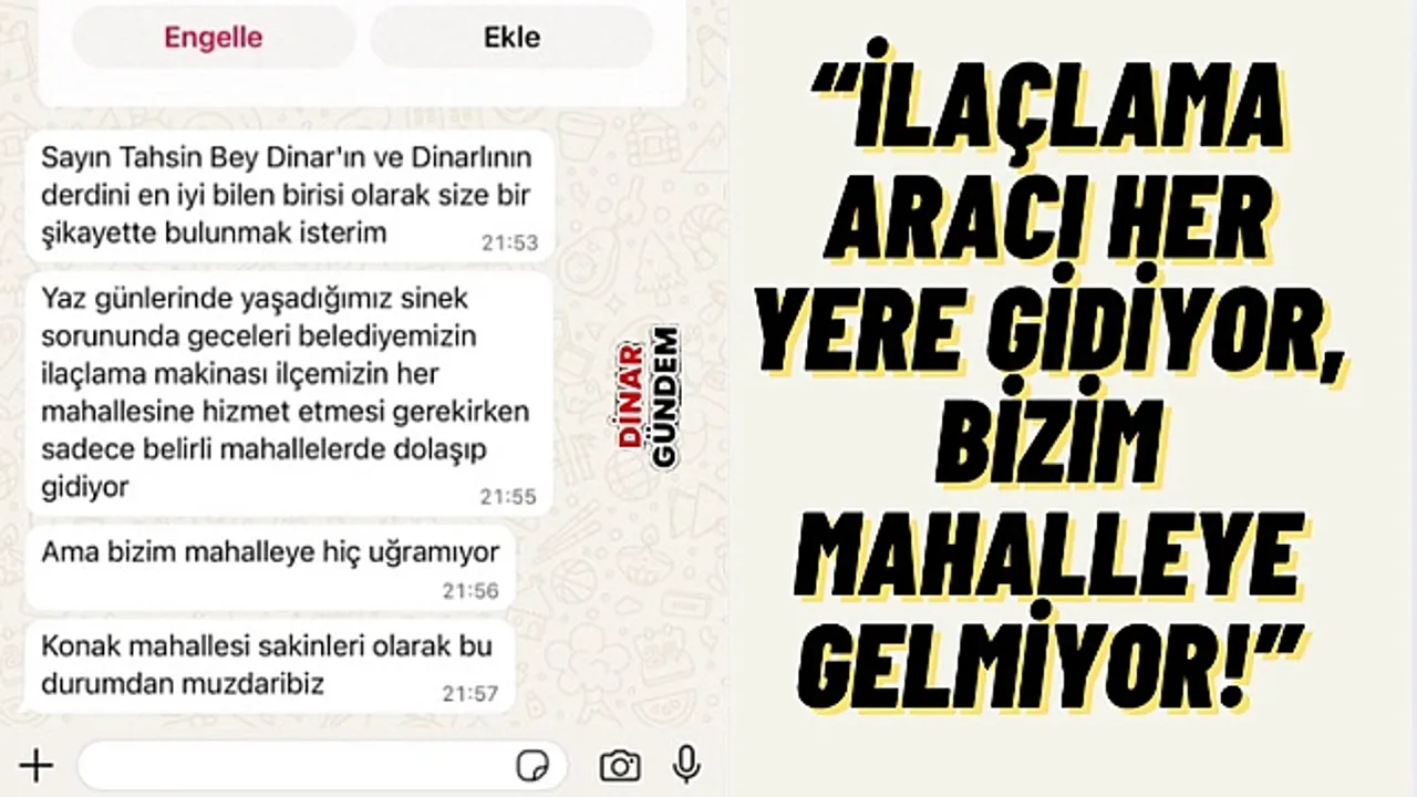 Dinar ilçesinde yaz aylarının gelmesiyle artan sinek sorunu bazı mahallelerde ciddi şekilde hissediliyor. Gazetemizin ihbar hattına ulaşan bir vatandaş, belediyeye ait ilaçlama aracının sadece belirli mahallelerde dolaştığını, Konak Mahallesi’ne ise hiç uğramadığını iddia etti.