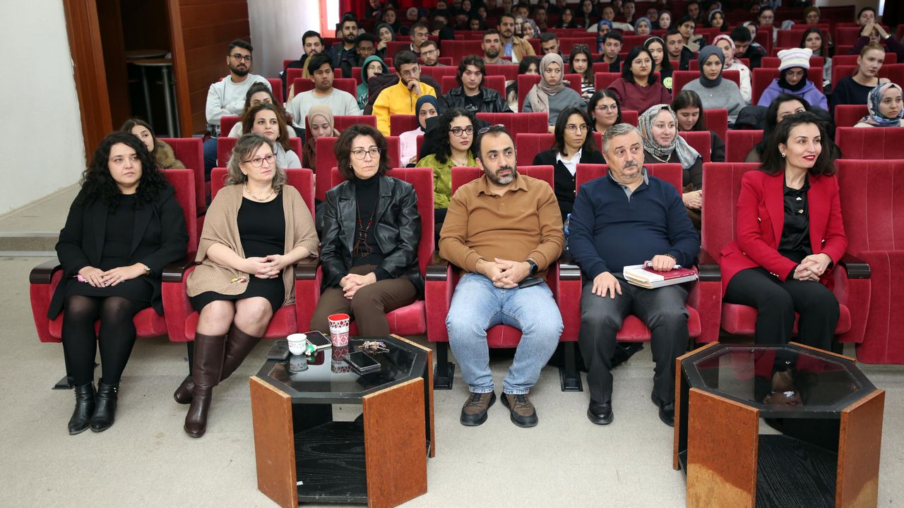 Erdal Akar Konferans Salonunda düzenlenen Fen Edebiyat Fakültesi Türk Dili ve Edebiyatı Bölümü Öğretim Üyesi Doç. Dr. Gönül Erdem Nas’ın konuşmacı olarak yer aldığı konferansa; Sosyal Bilimler Enstitüsü Müdür Yardımcısı Dr. Öğretim Üyesi Muhammed Salim Danış ile birlikte akademik personel ve öğrenciler katıldı.