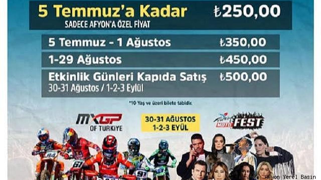 Afyonkarahisar"da organize edilecek Dünya Motokros Şampiyonası (MXGP Türkiye) ve Türkiye Motofest'in Afyon'a özel indirimli biletleri satışa çıktı.