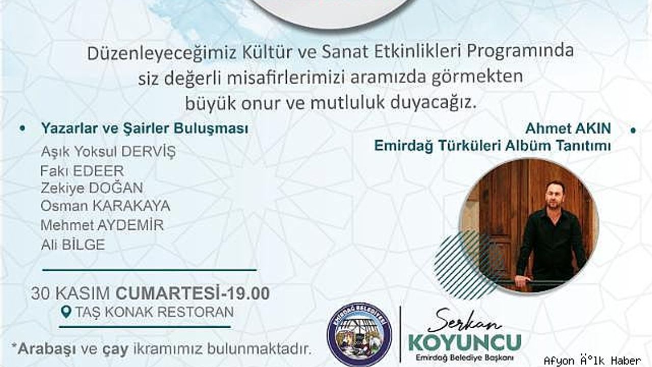 30 Kasım Cumartesi günü saat 19.00'da Taş Konak Restoran"da gerçekleşecek etkinlikte, Yazarlar ve Şairler Buluşması ile edebiyatın usta isimleri Aşık Yoksul Derviş, Fakı Edeer, Zekiye Doğan, Osman Karakaya, Mehmet Aydemir ve Ali Bilge katılımcılarla bir araya gelecek.
