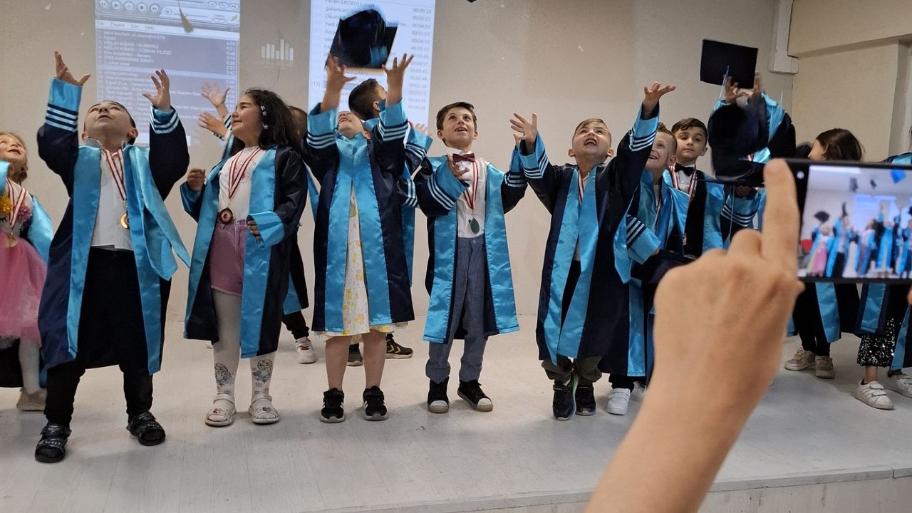 Öğrenci Velisi Nazan Metin’in sınıf öğretmeni Özcan Çalışkan’a teşekkür buketi sunması ve miniklerin madalya töreni ile son buldu.