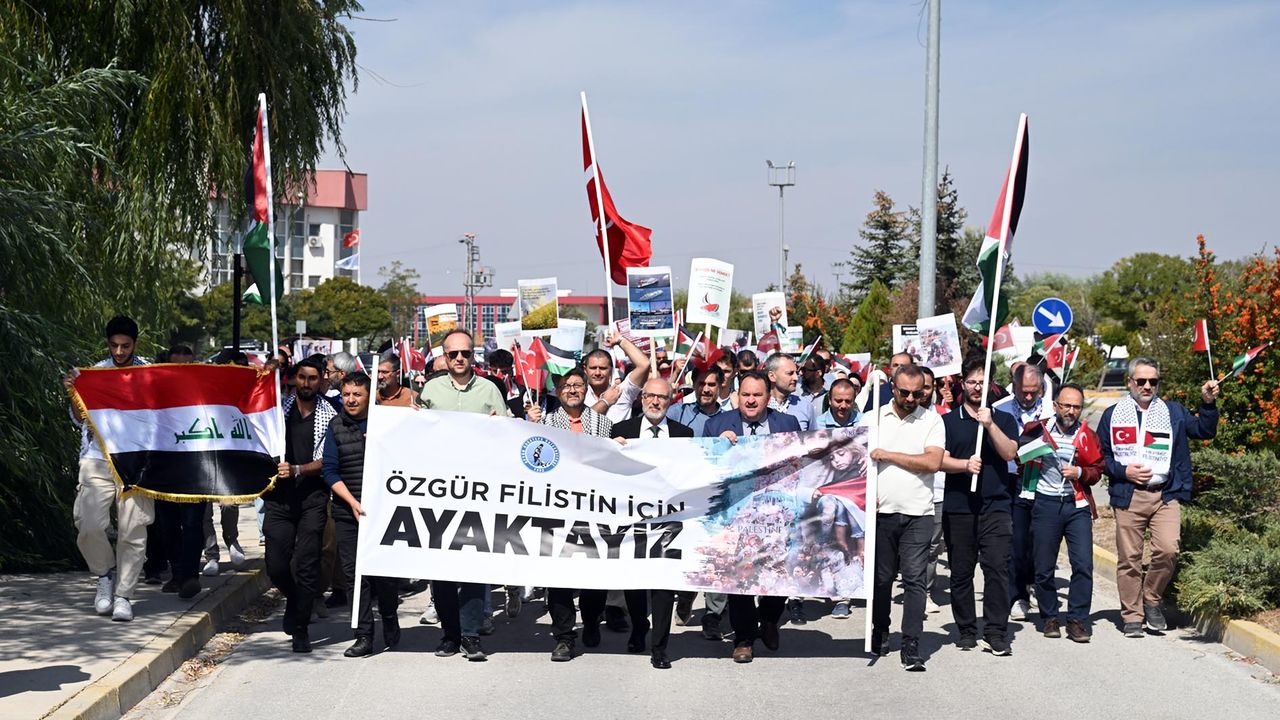 Afyon Kocatepe Üniversitesi (AKÜ) akademik ve idari personeli ile öğrencileri, İsrail’in Gazze’ye yönelik saldırılarını protesto etmek ve Küresel Sumud Filosu’na destek vermek amacıyla, eğitim-öğretim yılının beşinci gününde de yürüyüşlerine devam etti.