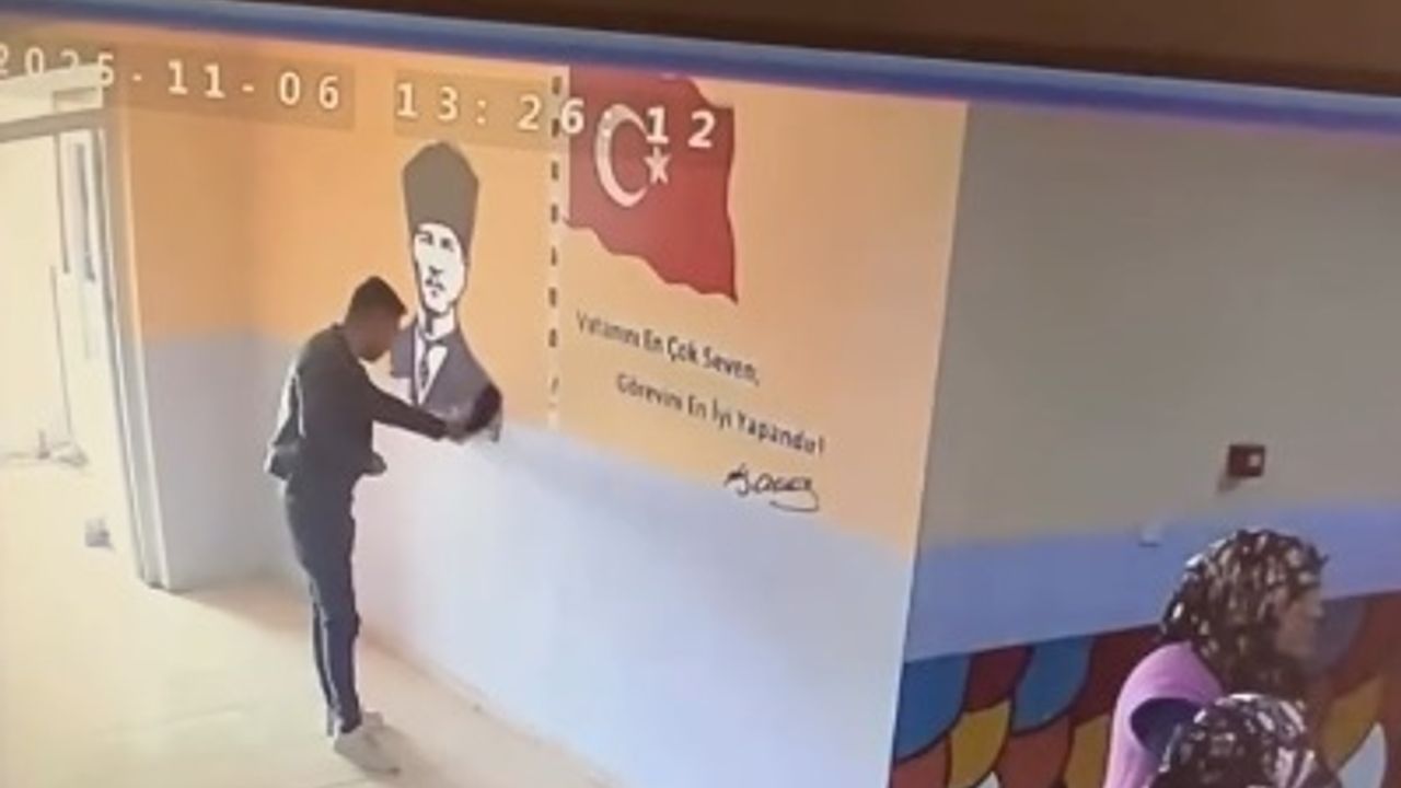 Anasınıfı öğrencisi Cemre KARTAL'ın babası Veli KARTAL kızını okuldan almaya geldiği saatlerde okulda bulunan ATATÜRK posterinin üzerinin toz olduğunu görerek ceketi ve eliyle temizliyor.