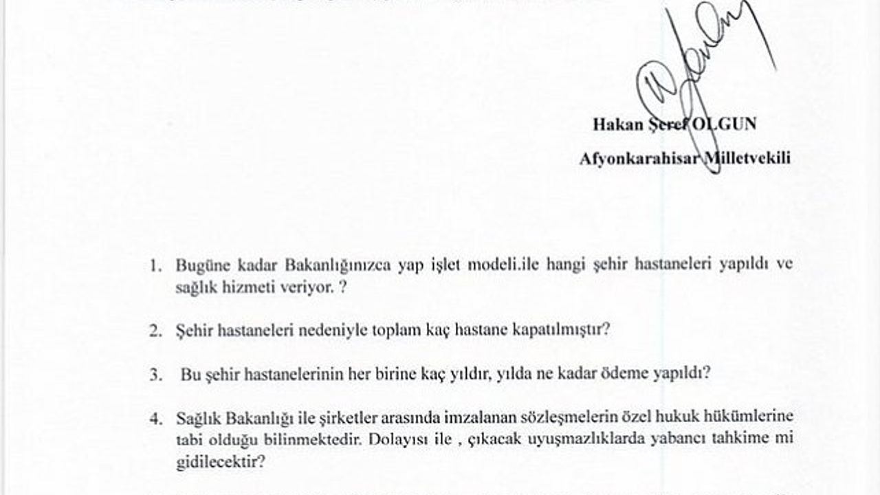 Sağlık Bakanı Memişoğlu'na yöneltilen soru önergesinde, hastanelerin işletim detayları ve kamuya açıklanmayan sözleşmelerin şeffaflığı sorgulandı. Av. Hakan Şeref Olgun, "Şehir Hastaneleri"nin bugüne kadarki işletim süreçlerinin ve bu süreçlere ilişkin sözleşmelerin kamuoyuna açıklanması gerekiyor. Bu konuda Sağlık Bakanı'nın açıklamalarını merakla bekliyorum," ifadelerini kullandı.