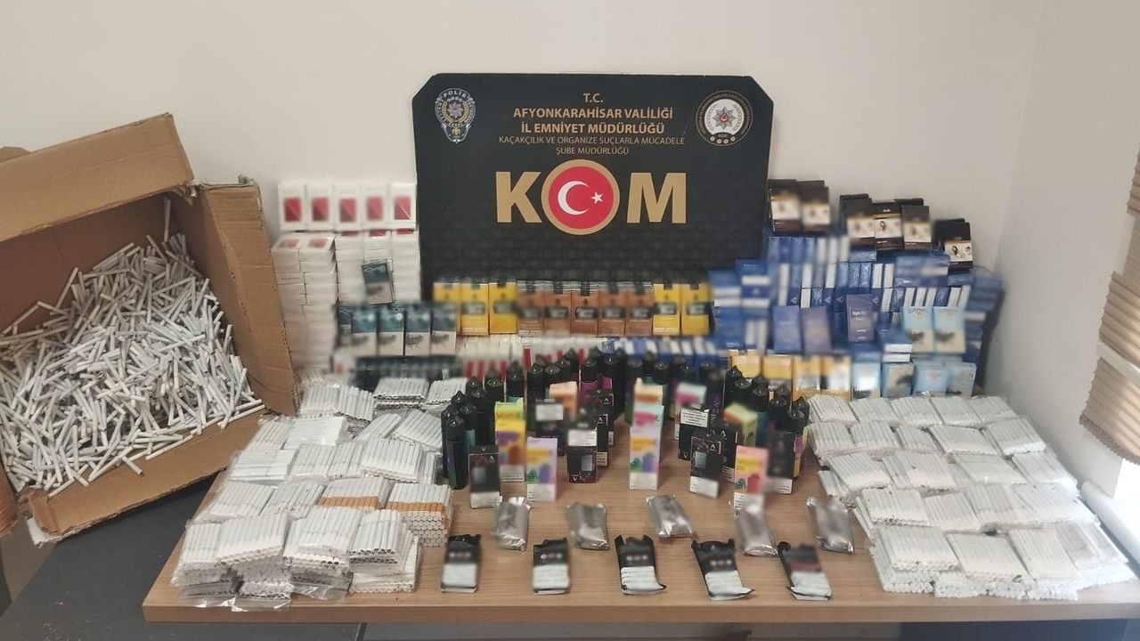 Afyonkarahisar polisi, Işıklar Beldesi'nde yapılan operasyonda büyük miktarda kaçak makaron ve nargile kömürü ele geçirdi. 2 şüpheli hakkında adli işlem başlatıldı.