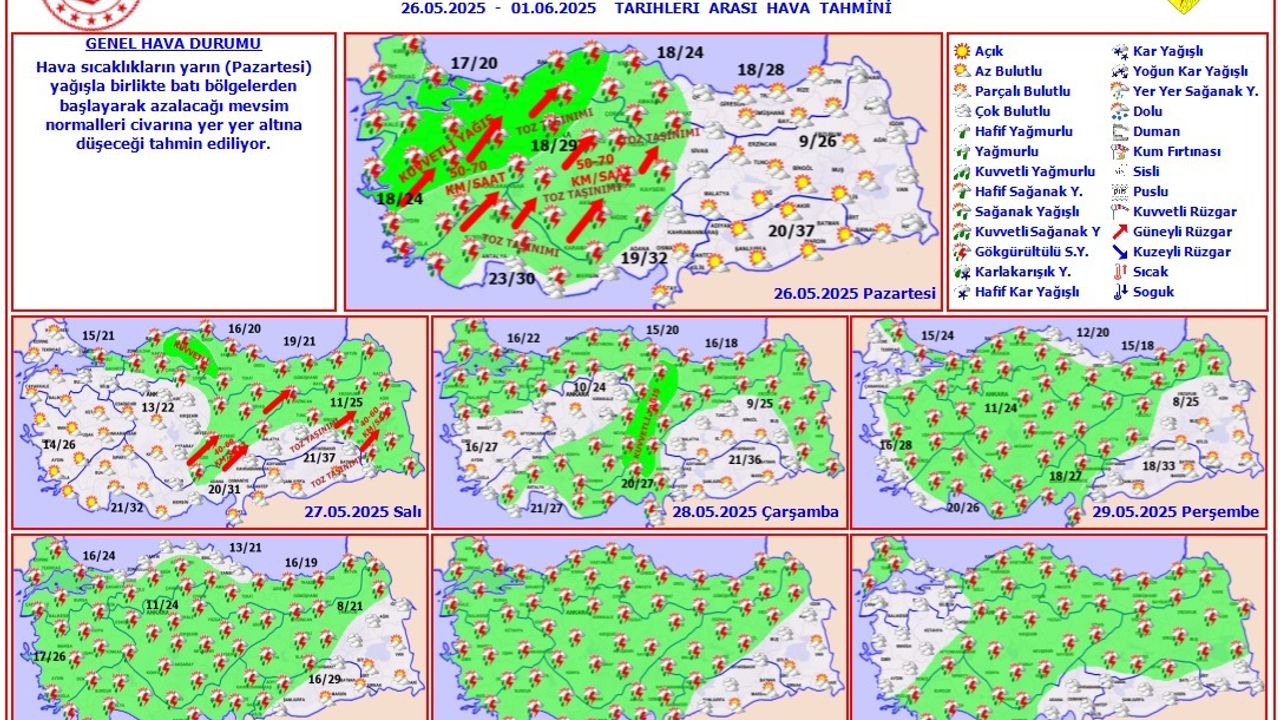26.05.2025 Pazartesi öğle saatlerinden itibaren Afyonkarahisar genelinde güney yönlerden kuvvetli rüzgâr ve kısa süreli fırtına (50-70 km/saat, yer yer 90 km/saat) beklenmektedir.