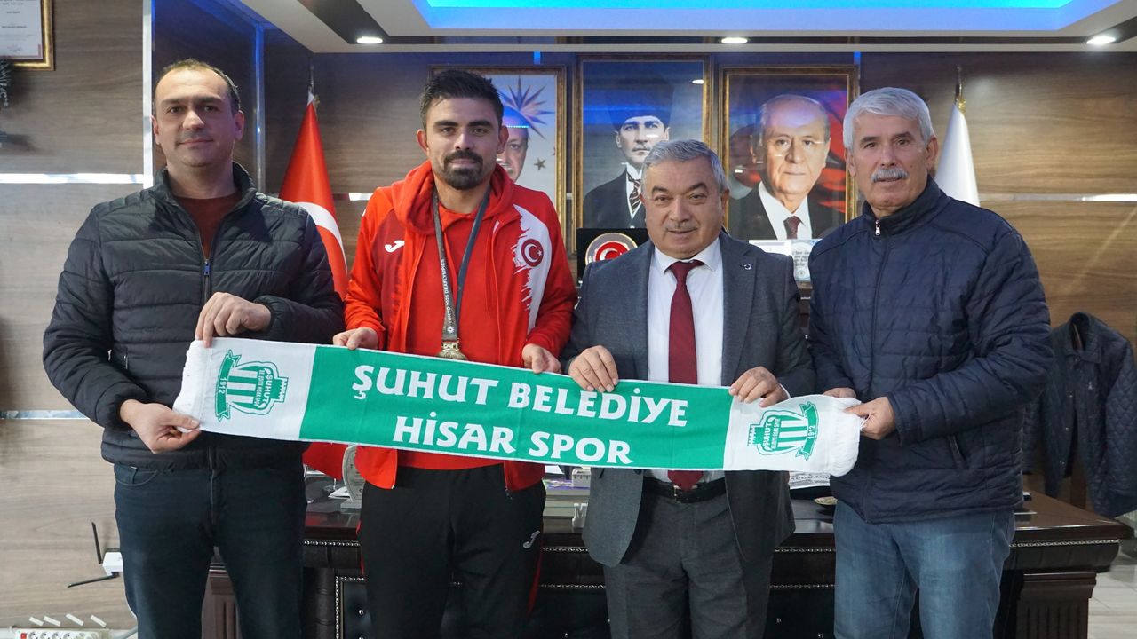 İşitme Engelli Milli Futbol Takımı’nın başarılı oyuncusu Emre Kılınç Şuhut Belediye Başkanı Muhittin Özaşkın’ı ziyaret etti. Özşakın, “Milli Takımda Şuhutlu bir sporcunun olması hepimizi gururlandırdı. Başarıya giden yolda hiçbir şey engel değildir. Yeterki çalışmanızdan ödün vermeyin” dedi.