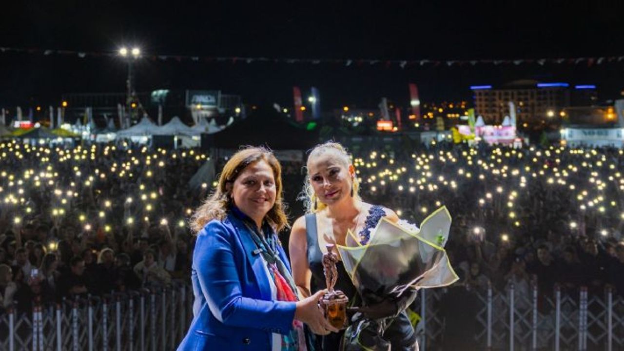 Funda Arar’a çiçek ve hediye takdim eden Başkanımız Burcu Köksal, “Cumhuriyetin kazanıldığı topraklara, zaferin, termalin, mermerin başkentine hoş geldiniz. Burası havası sert, insanı mert Afyonkarahisar. Sizi burada ağırlamaktan dolayı çok mutluyuz. İyi ki geldiniz, iyi ki varsınız. Ben sizin büyük bir hayranınızım ve birçok şarkınızı ezbere bilirim. Ülkemizin böylesine kıymetli sanatçılara ihtiyacı var. Atatürk diyor ki, ‘Her şey olabilirsiniz ama sanatçı olamazsınız.’ gerçekten öyle.” diyerek sanatçıya teşekkürlerini iletti.