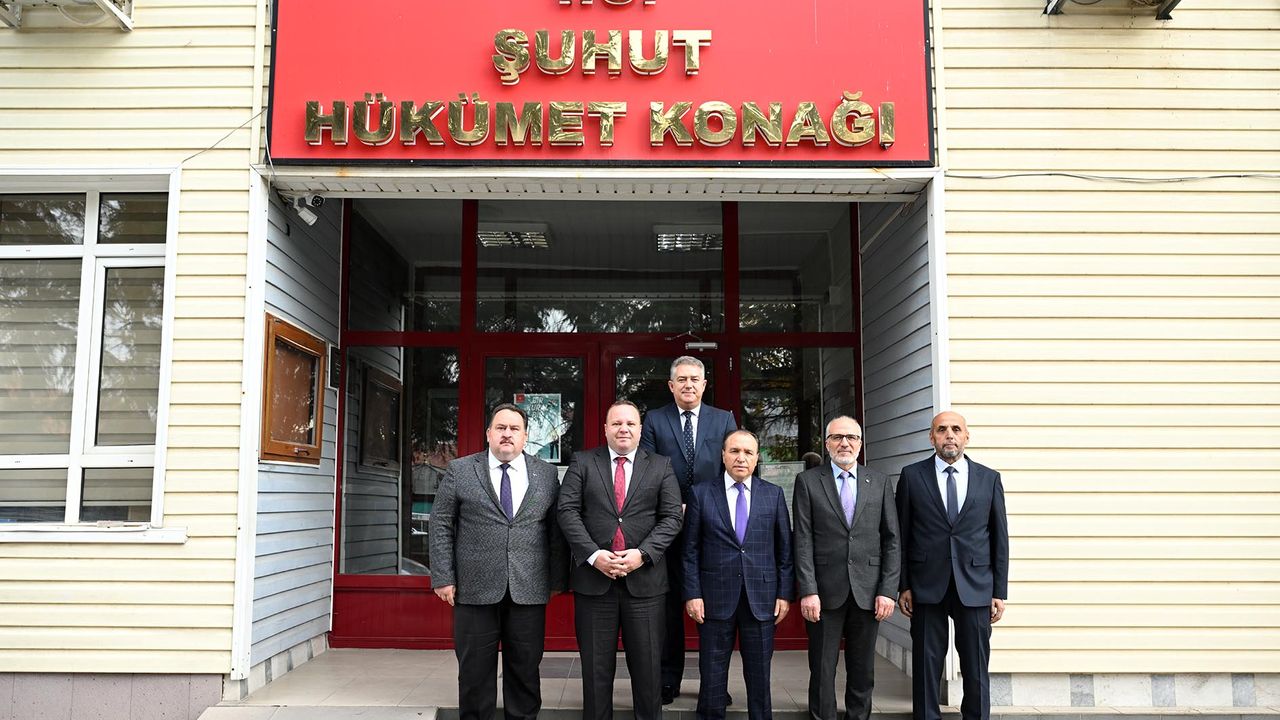 Rektör Prof. Dr. Mehmet Karakaş, ziyaretlerin ilkinde Rektör Yardımcısı Prof. Dr. Murat Peker, Şuhut MYO Müdürü Prof. Dr. Halil Selçuk Biricik, AKÜ Genel Sekreteri Hasan Düzgün ve Yapı İşleri ve Teknik Daire Başkanı Ömer Gürcan ile birlikte Şuhut Kaymakamı İzzet Cem Eser’i makamında ziyaret etti. Gerçekleşen ziyarette; Şuhut Meslek Yüksekokulundaki programlara dair istişarede bulunuldu. Karakaş ve beraberindeki heyet daha sonra Şuhut Belediye Başkanı Muhittin Özaşkın’ı makamında ziyaret etti. Ziyarette; AKÜ ile Şuhut Belediyesi arasındaki mevcut iş birliği konuları ve üniversite belediye iş birliğiyle yürütülebilecek yeni projeler hakkında fikir alışverişinde bulunuldu.