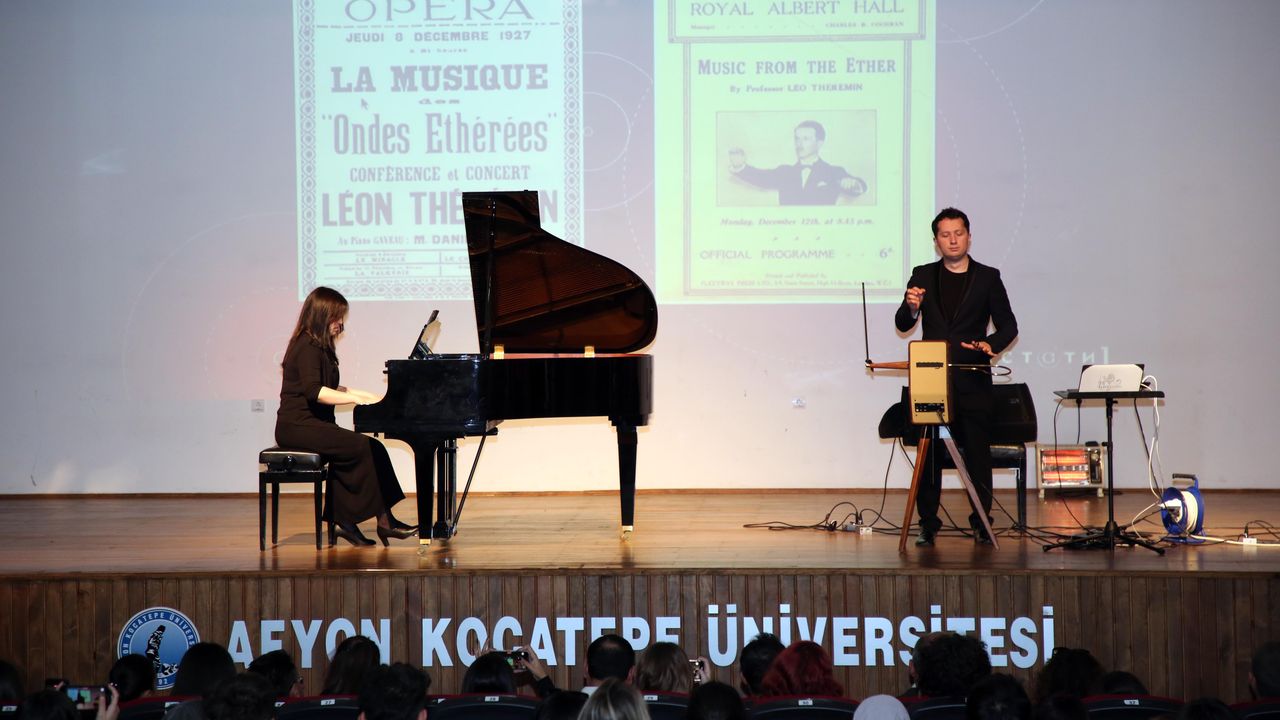 Afyon Kocatepe Üniversitesi (AKÜ) Devlet Konservatuvarı düzenlenen etkinlikte Rus Müzisyen Peter Theremin tarafından temassız müzik enstrümanı “Theremin” ile müzik dinletisi ve söyleşi gerçekleştirildi.