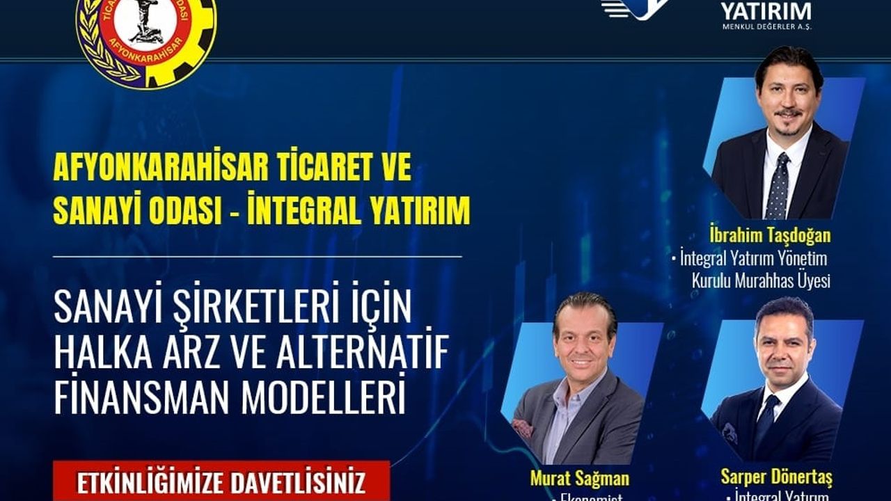 Afyonkarahisar Ticaret ve Sanayi Odası (ATSO) ile İntegral Yatırım iş birliğinde, 3 Aralık 2025 Çarşamba günü saat 17.00’de ATSO Hizmet Binası Meclis Salonu’nda “Sanayi Şirketleri için Halka Arz ve Alternatif Finansman Modelleri” paneli gerçekleştirilecektir.