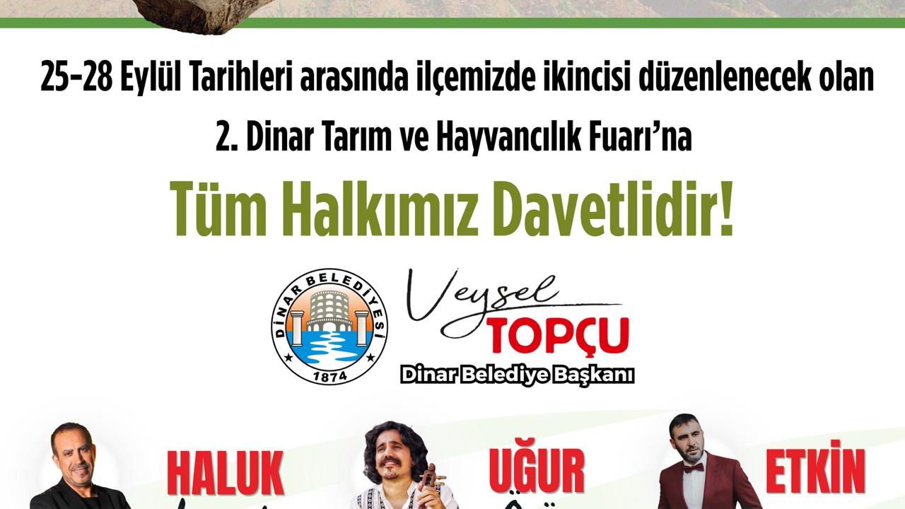 Fuar açılışı 25 Eylül 2025 Perşembe günü saat 14.00’te Dinar Belediyesi Çok Amaçlı Fuar Alanı’nda yapılacak. Fuar süresince ilçemizde birbirinden değerli sanatçılar sahne alacak: