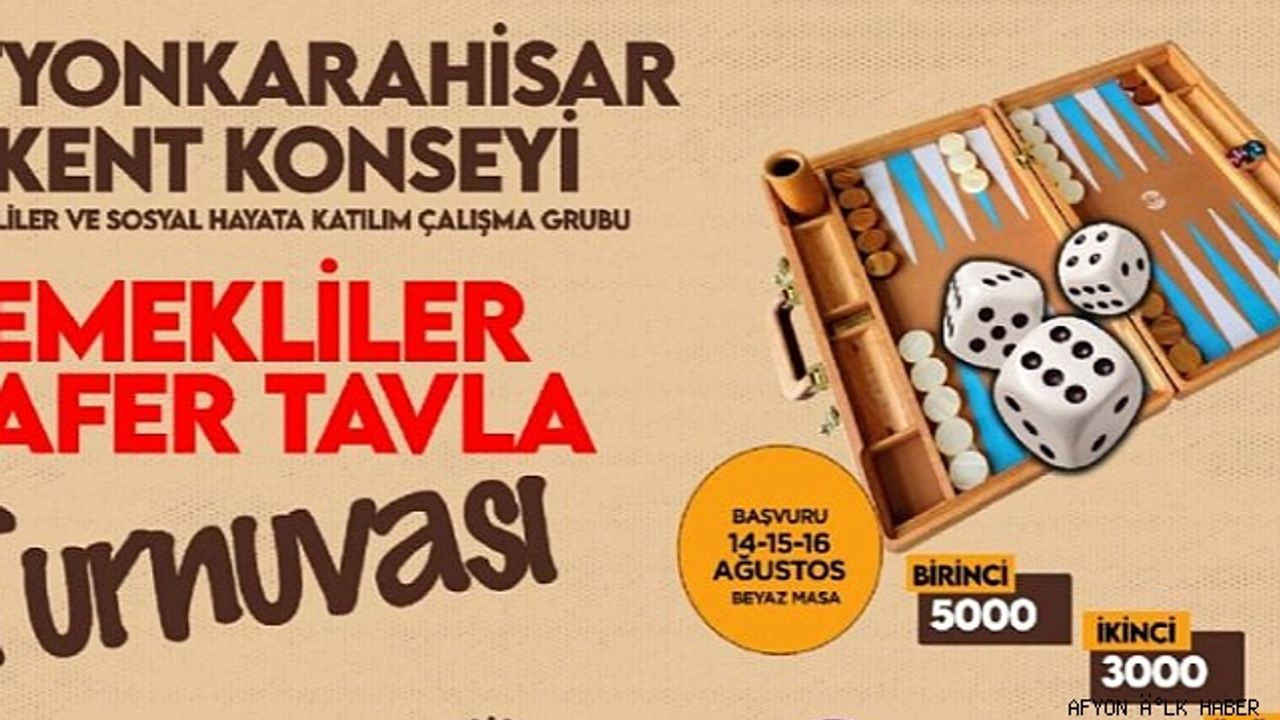 Afyonkarahisar Belediyemiz ile Kent Konseyi Emekliler ve Sosyal Hayata Katılım Çalışma Grubu işbirliğinde emeklilere özel düzenlenecek tavla turnuvası için başvurular yarın (16 Ağustos Cuma) sona eriyor.
