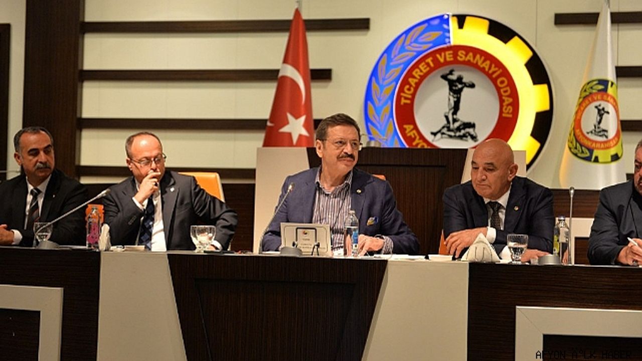 “Bugün bütün günümüzü Afyonkarahisar"a ayırdık. Önce Borsamızın yaptırdığı Lisanslı Deponun açılış törenine katıldık. Arkasından, Dinar ve Sandıklı"daki Oda-Borsalarımızı ziyaret ederek üyelerimizle bir araya geldik. Şimdi sizlerle istişarelerde bulunacağız. Esasen sizleri dinlemek istiyoruz. O yüzden kısa bir giriş yapıp sözü size bırakacağız. Ben öncelikle, bugün bizleri buluşturan Hüsnü Serteser Başkanımıza teşekkür ediyorum. Afyon; termal ve doğa turizminin, gastronominin, gıdanın, sanayinin ve mermerin marka şehri. Afyon"un lezzetleri de dünya çapında tescil edildi. Gastronomi alanında Unesco listesine dahil oldunuz. Sanayi"de de müthiş bir gelişme gösteriyorsunuz. 7 OSB"miz vardı, 3 tane daha geliyor. İşte Hüsnü kardeşim de, gelişen Afyon"a yakışan, müthiş bir azimle ve heyecanla çalışıyor. Sizlere Avrupa standardında hizmet sunuyor. Zaten Odamız akredite – yani 5 yıldızlı Oda. İşte Hüsnü Başkanımız da bu vizyonla hareket ediyor. Kendisiyle, TOBB Genel İdare Kurulu"nda ve GTİ Yönetim Kurulu"nda birlikte çalışıyoruz. Tecrübelerinden Ankara"da da istifade ediyoruz. Kendisi proje üretiyor, üyelerimizin derdine çözüm getiriyor. Afyon ve sizler, daha çok zenginleşsin diye çalışıyor. Türkiye"de bir ilk olacak Sağlık Endüstri Bölgesi ve KOBİ Hastanesi gibi vizyoner işlere imza atıyor. Odamız, yerel değerlere de sahip çıkmıştır. Afyon Mermeri, Sucuğu, Pastırması, Manda Yoğurdu ve Kaymağını coğrafi işaretle koruma altına almıştır. Gazi Mesleki ve Teknik Anadolu Lisesi"nin hamiliğini üstlenerek, iş dünyamızın nitelikli çalışan bulma sıkıntısına çözüm üretmiştir. Oda hizmet binasına aldığı, dünya çapında da ödül kazanan, Yeşil Bina sertifikasıyla da, bir başka ilke imza atmıştır. Oda bünyesinde kurduğu Tahkim ve Arabuluculuk Merkeziyle, ticarette karşınıza çıkan hukuki ihtilafları, en hızlı şekilde çözmenize yardımcı olmaktadır. Bakın ticari anlaşmazlıklarda buraya gelen dosyaların yarıya yakını, ortalama 20 günde anlaşmayla sonuçlanıyor. Odamızın sunduğu bu imkanı da mutlaka kullanmanızı tavsiye ediyorum. Vizyonunu ve farkını gösteren Hüsnü Başkanımızı tebrik ediyorum. Kendisiyle birlikte çalışıyor olmaktan büyük memnuniyet duyduğumu ifade etmek istiyorum. Yaptıkları tüm bu örnek çalışmalar ve şehrimize kazandırdıkları eserlerden dolayı, Hüsnü Serteser başkanımız başta olmak üzere, tüm yönetimini, meclisini, genel sekreterimizi ve çalışan kardeşlerimi yürekten kutluyorum. Değerli dostlar, Eğitime yapılan yatırımın asla zarar etmeyeceğiz şiarı ve sizlerin talebiyle Afyon Merkez ve Bolvadin"de TOBB olarak 2 lise yaptık. Şimdi de yine sizin talebinizle Çay, Dinar,