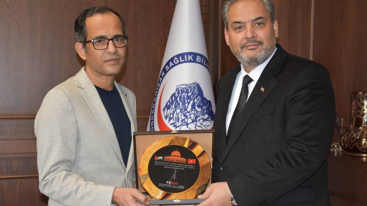 Afyonkarahisar Sağlık Bilimleri Üniversitesi ( AFSÜ) Rektörü Prof. Dr. Adem Aslan, Filistinli Tabipler ve Sağlık Mensupları Derneği (Palmed) tarafından verilen teşekkür plaketini kabul etti.
